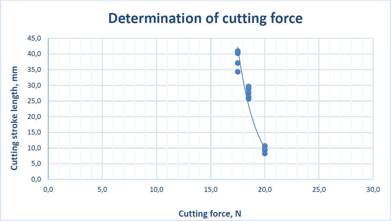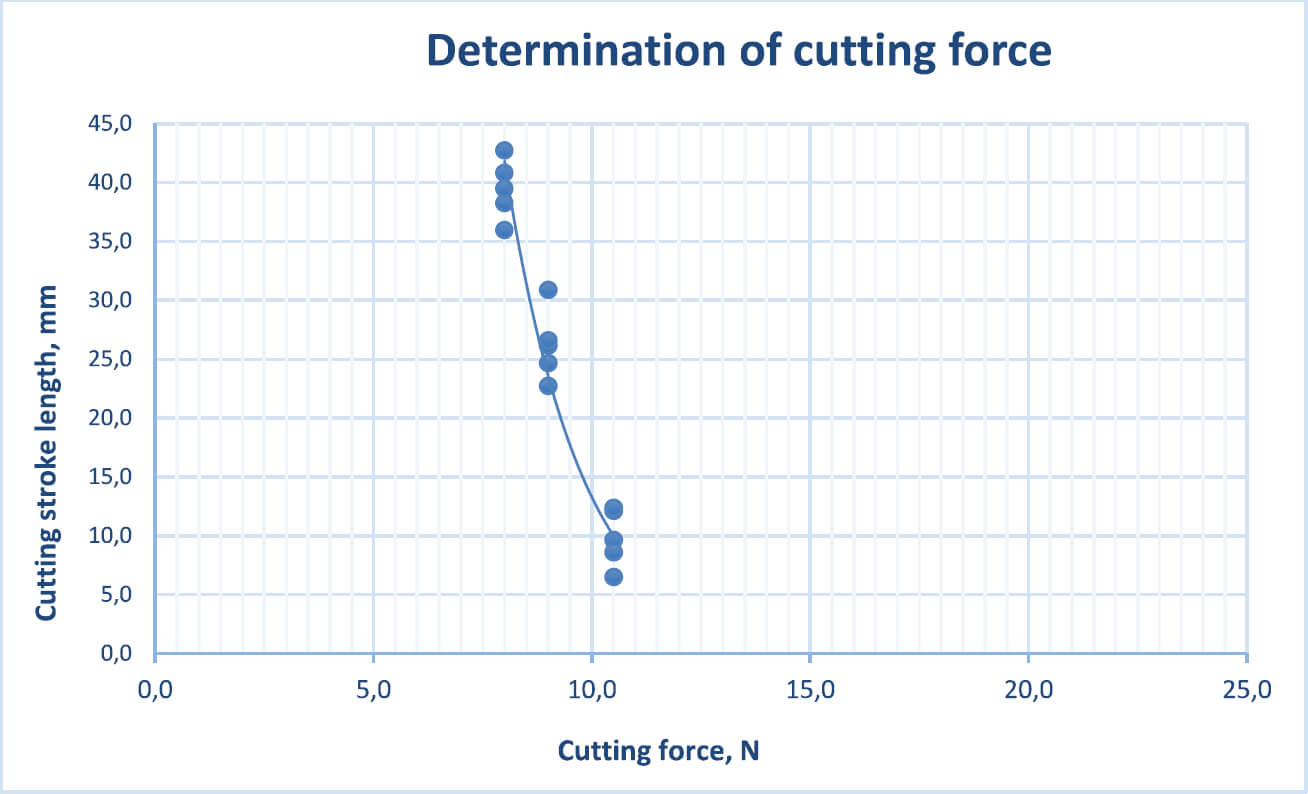 | Sample Cut | x Force, N | Stroke length, mm | y Stroke length with correction factor, mm (normalized) | y'=log10y | (xi-X)2 |