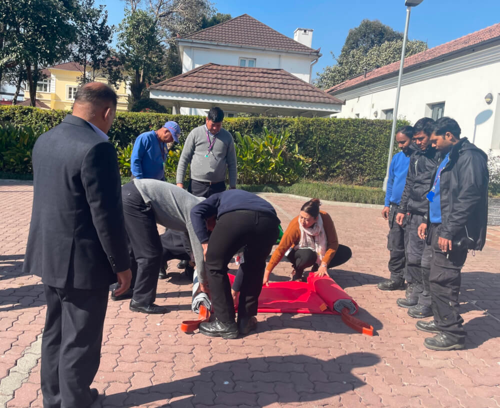 The images show Fire Cloak™ equipment outside the British Embassy in Kathmandu and members of Everest Fire undergoing Fire Cloak™ deployment training.